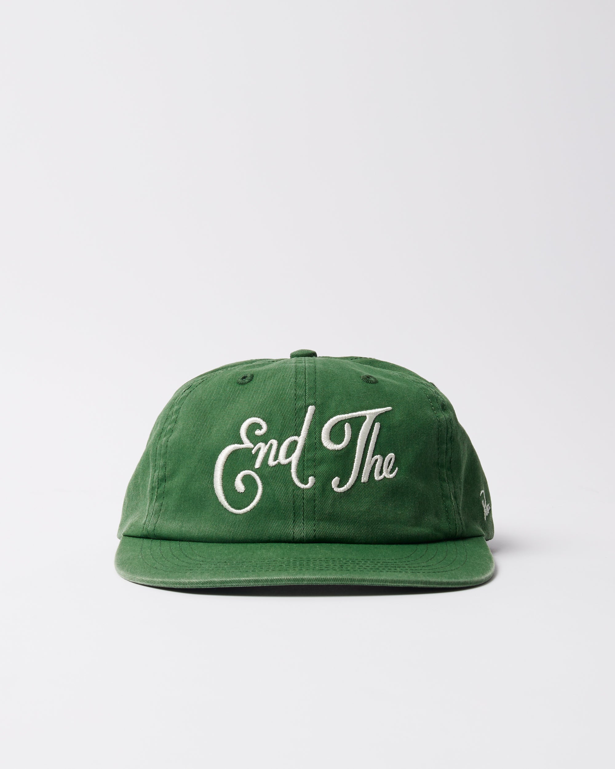 Unconstructed cotton twill fabric hat. With big "End the" embroidery on the front and a signature logo on the side.