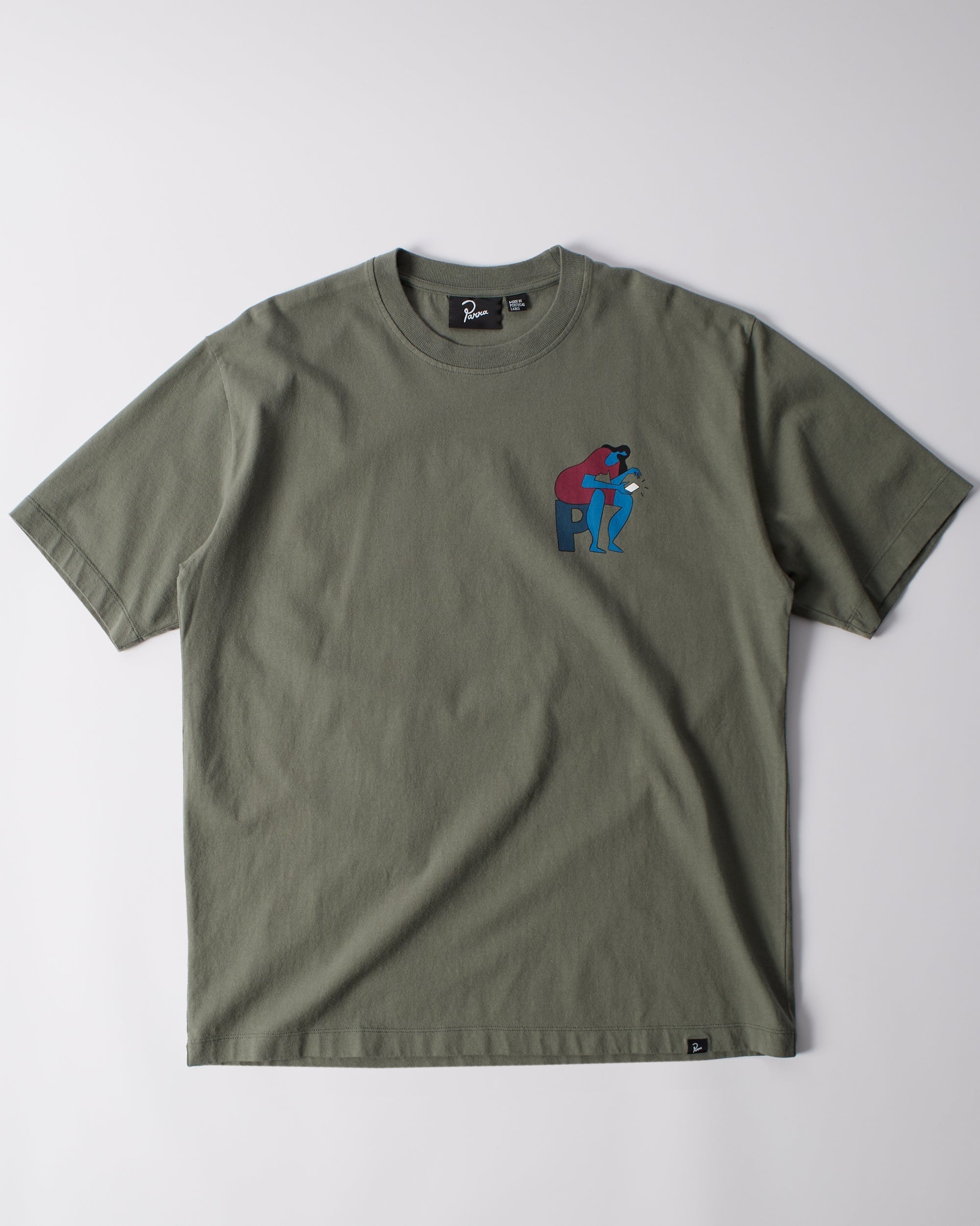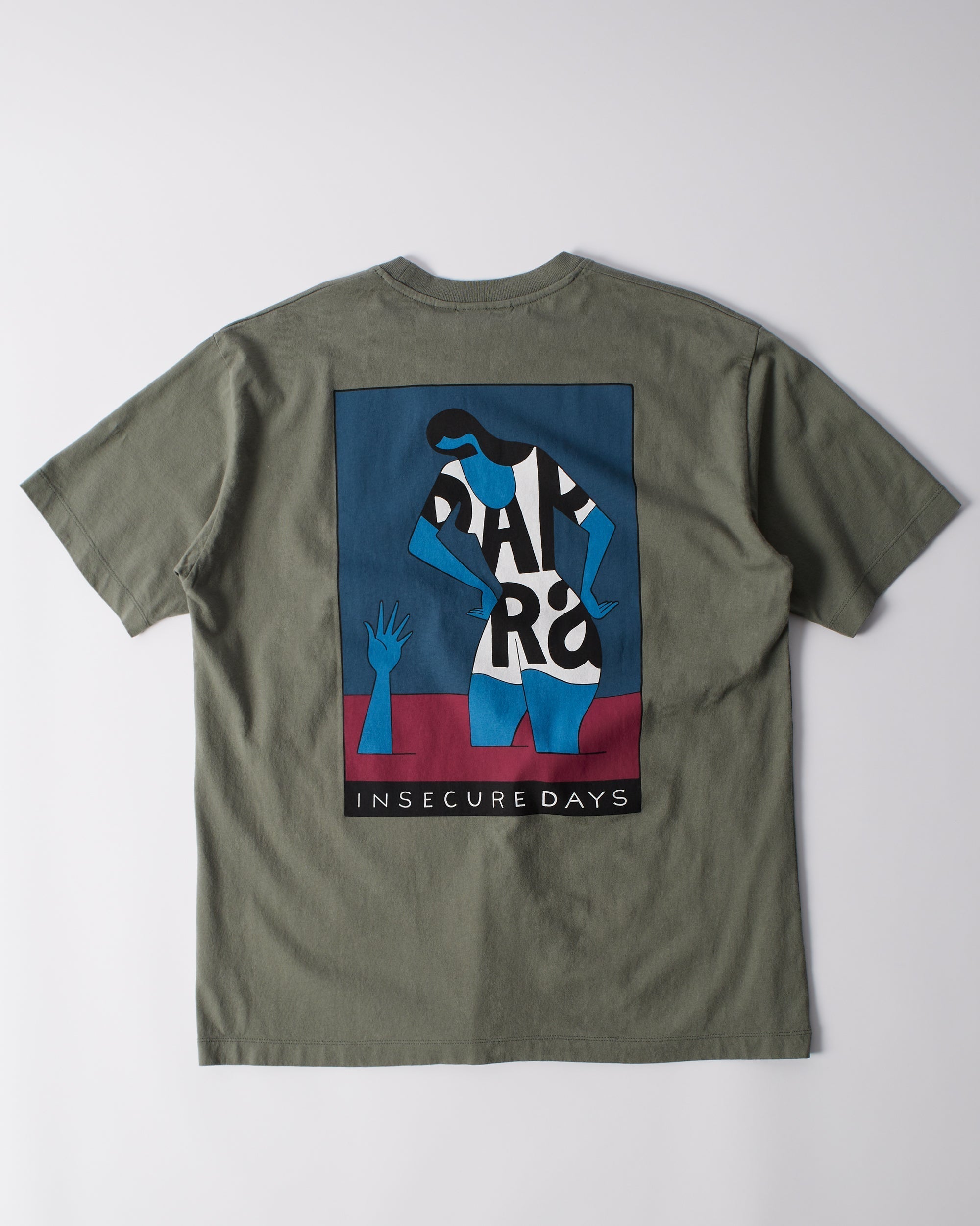 Insecure days artwork as a waterbased screenprint at the back and printed on the chest. All Parra t-shirts are a boxy custom fit.