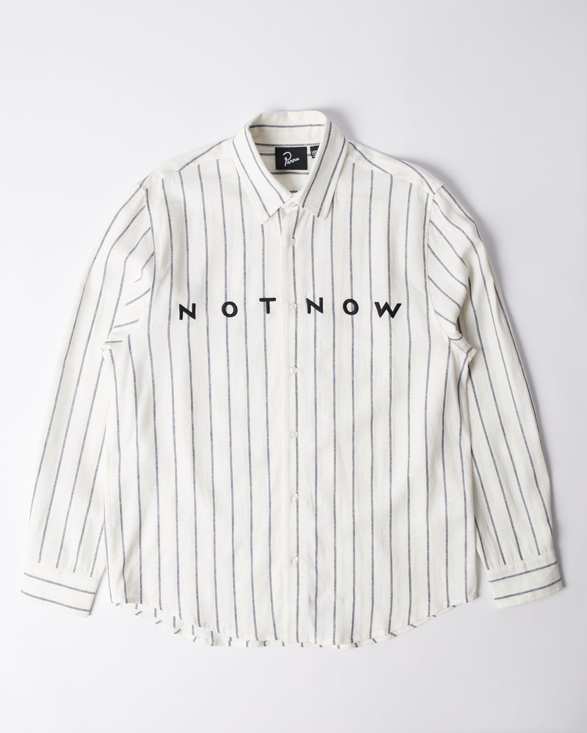 Lightweight shirt made from linen and viscose. Stripes are woven into the fabric, and 'Not now' as an embroidery on the chest.