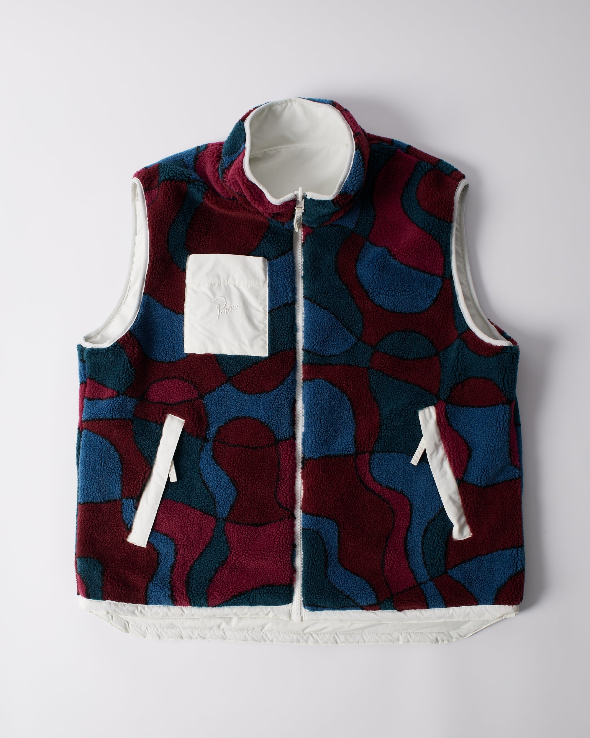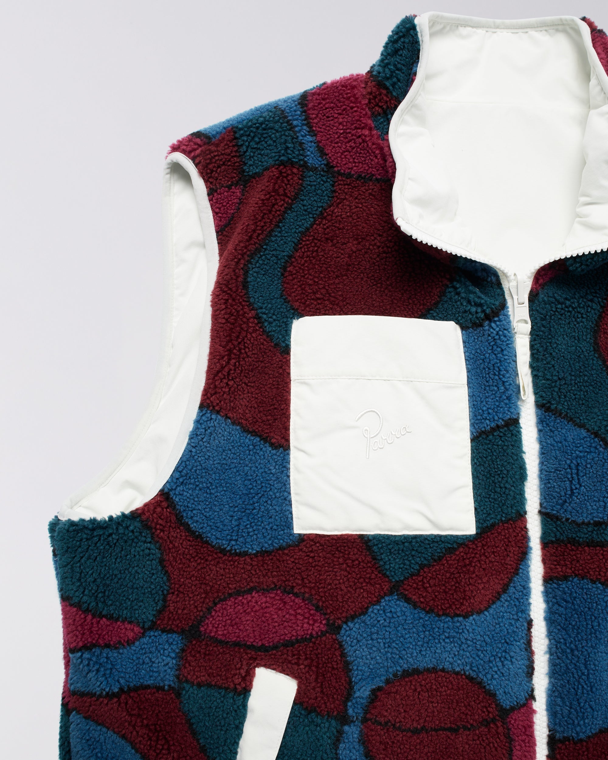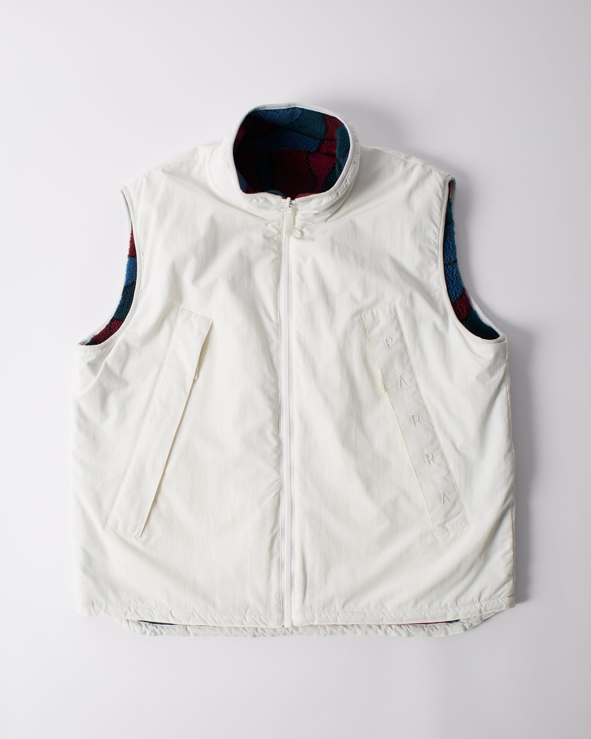 Reversible vest with custom printed polar fleece shell and plain blue on the other shell. Tonal Parra embroidery on the pocket