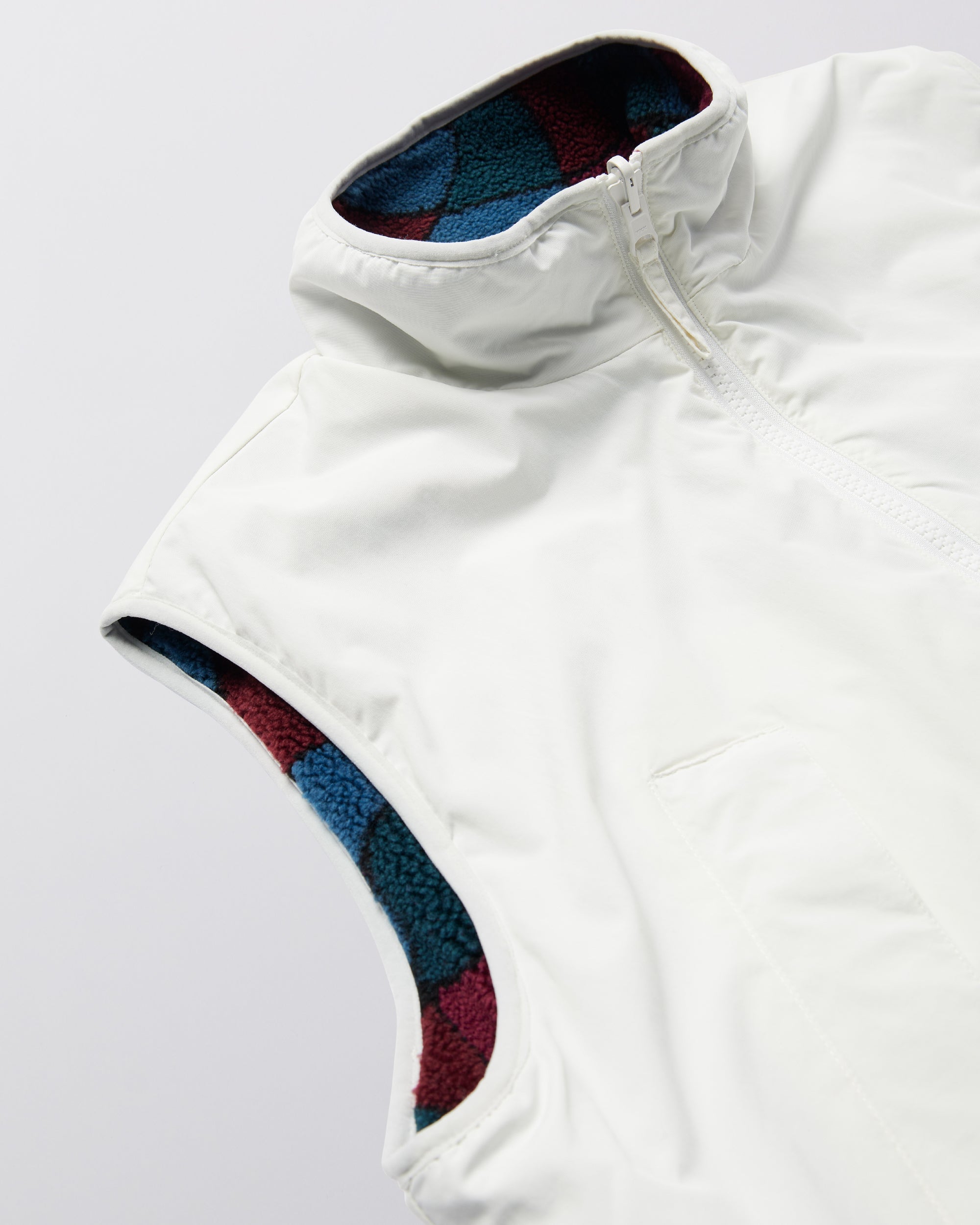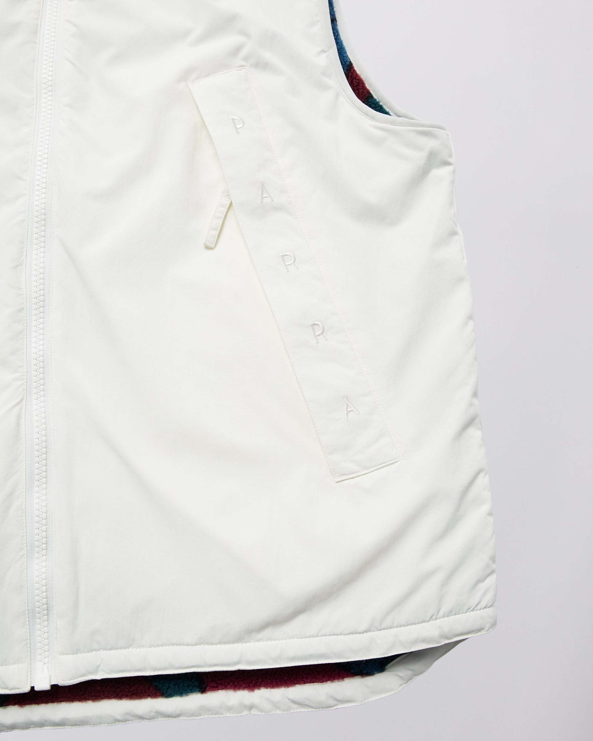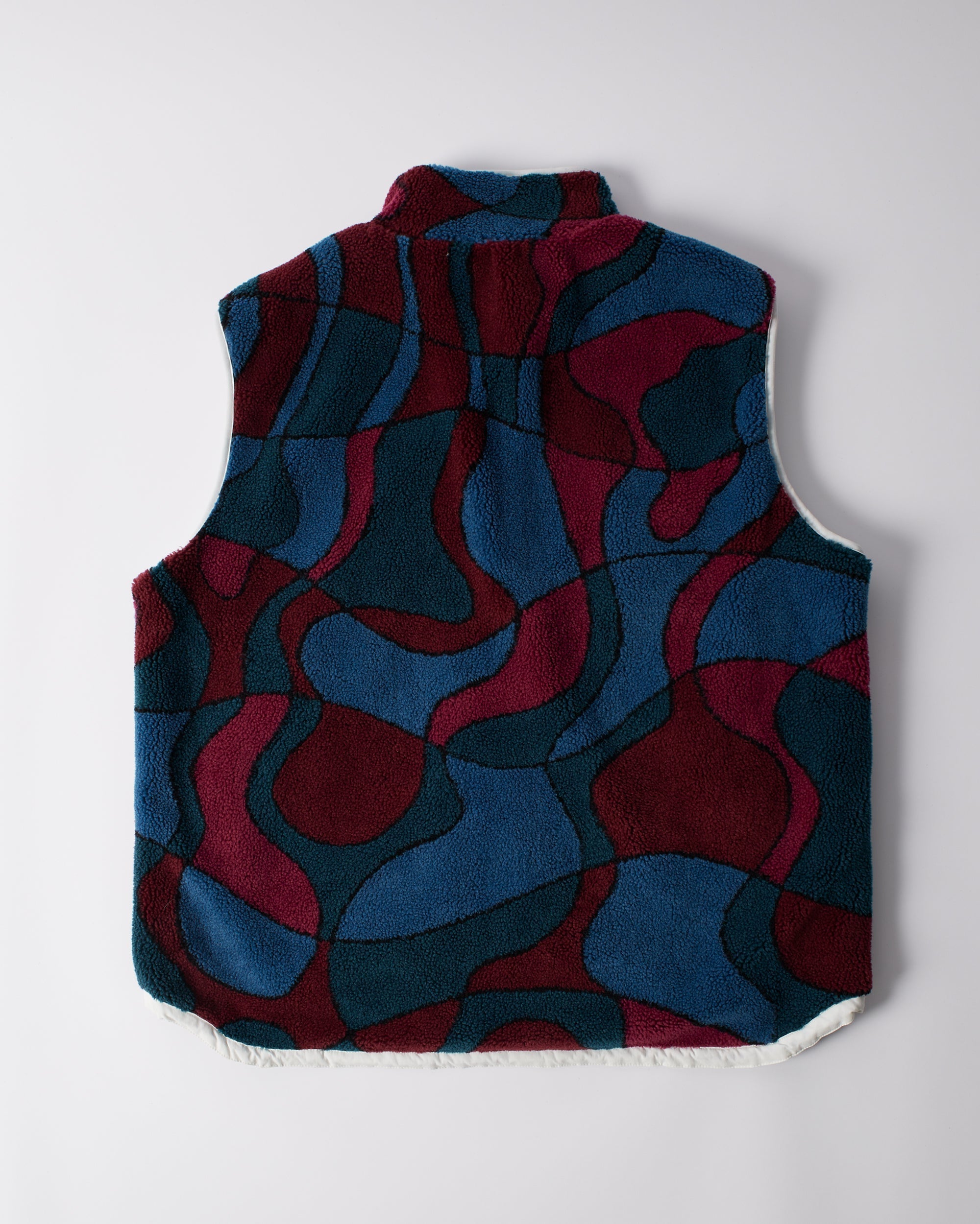 Reversible vest with custom printed polar fleece shell and plain blue on the other shell. Tonal Parra embroidery on the pocket